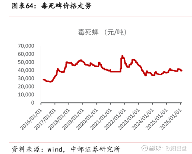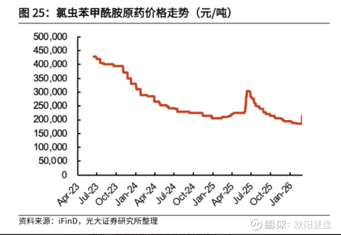 公司另一个值得关注的单品是氯虫苯甲酰胺,氯虫苯甲酰胺正处于底部剧烈反转后的右侧加速上行期,截至2026年3月上旬,原药价格已跳涨至 25万元/吨,较春节前低点(约18.8万元/吨)反弹幅度超 30%。氯虫产业链中,从“间二甲苯”到“2-硝体”的硝化反应属于高危工艺。2025-2026年连续发生的爆炸事故(如山东友道、山西佳鹏)导致监管极度收紧,再叠加行业自律(行业协会第二次会议定调价格红线为25.5万元/吨)的双重驱动推升了价格。不过公司也是由于缺2-硝体这个原料导致氯虫上游的K胺产能无法正常开工,需要外购K胺才能维持氯虫的生产,导致这一部分利润目前不能最大化。往后需跟踪发生爆炸的企业复产情况,以及公司K胺产能的开工情况。