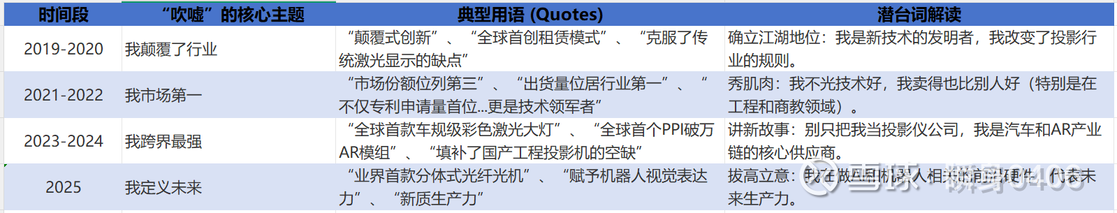 (2)演变: 从2023年开始,特别强调“以原创半导体激光光源技术...构筑专利护城河” 。