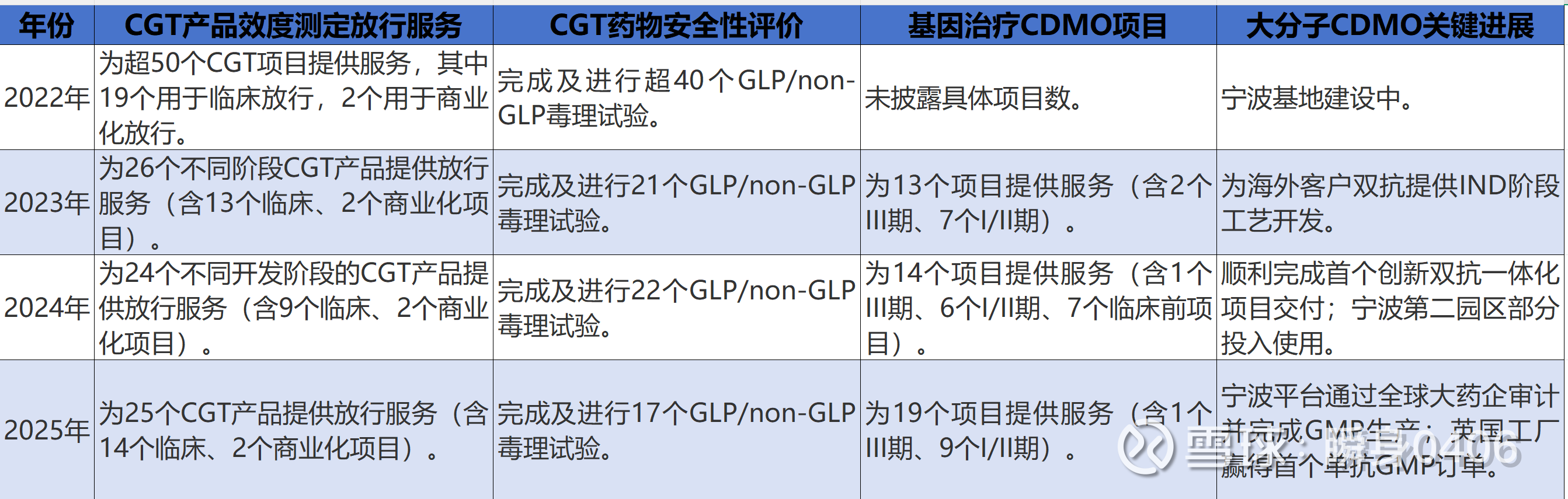 依托这一优势,2025年,康龙化成合计为25个不同开发阶段的CGT产品提供效度测定放行服务(含2个商业化项目和14个临床项目),并进一步将服务拓展至CAR-T细胞疗法及LNP递送药物的生物分析。