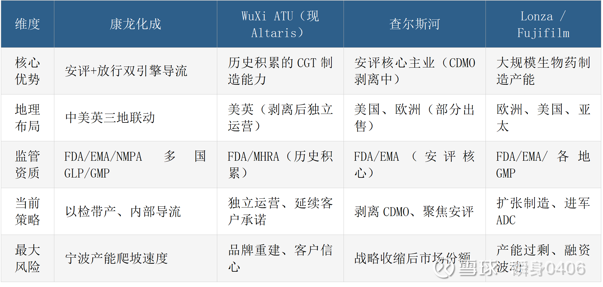 行业内发生的若干事件为这一路径提供了侧面印证:WuXi ATU美英业务的剥离揭示了重资产CGT CDMO在地缘政治不确定性下的脆弱性;查尔斯河剥离CDMO制造业务、回归安评检测核心则说明,高壁垒合规服务与重资产制造的组合并非必然协同。康龙选择的“以检带产”路径,在逻辑上规避了这两个陷阱。