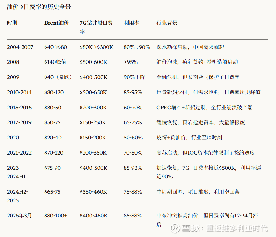 3、格局出清:过去十年行业经历了残酷的淘汰。2024-2026年,每年都有行业合并案例发生,现在市场只剩下少量玩家(Transocean, Noble, Seadrill, COSL),这意味着对上下游都有更强的议价能力。