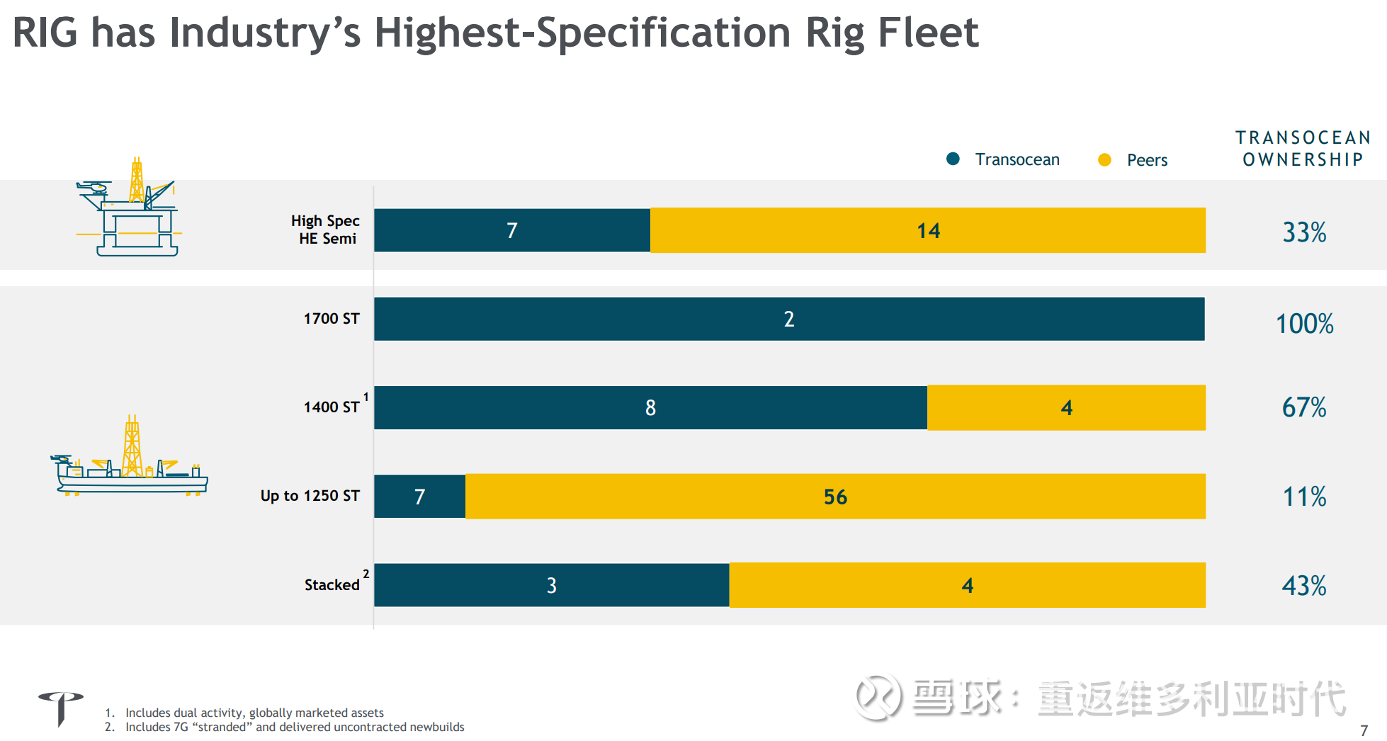 2、今年2月宣布收购VAL,补全了浅海jackups(31座),提供稳定现金流,合并后的RIG将拥有73座钻井平台。完成收购后RIG的深水份额将从现在的~27%提升到~45%(42座),同时在整个离岸钻井市场的份额也将大幅提升到45%。(有反垄断不确定性,后续预测暂不考虑合并后的情况)