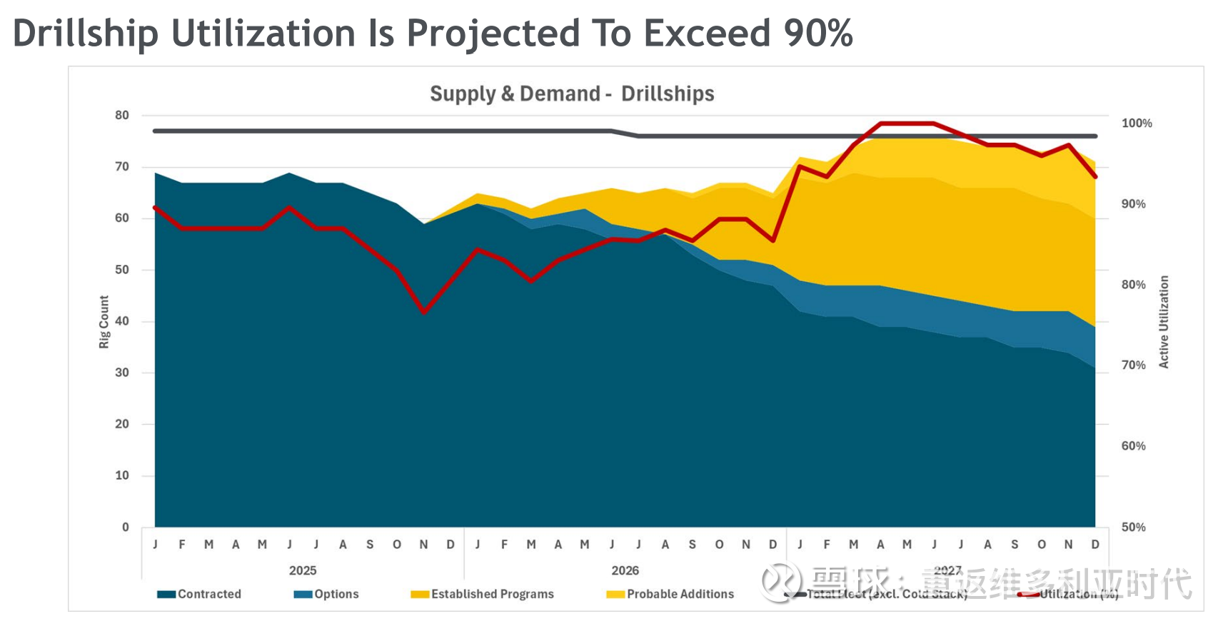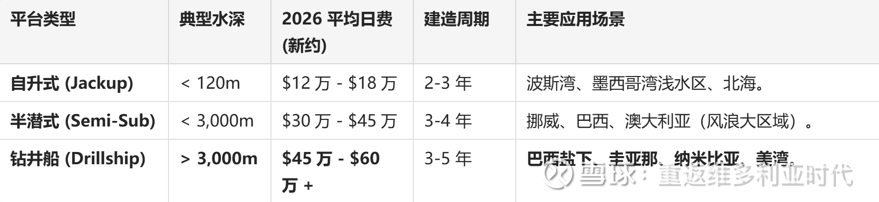 2、行业供给超强刚性:全球高规格深水钻井平台(Ultra-Deepwater Floaters)的有效供给已接近极限。新造船成本高达 $10 亿且需 3 年以上周期。,且冷封船的重启成本预估$1亿,周期需 12个月。