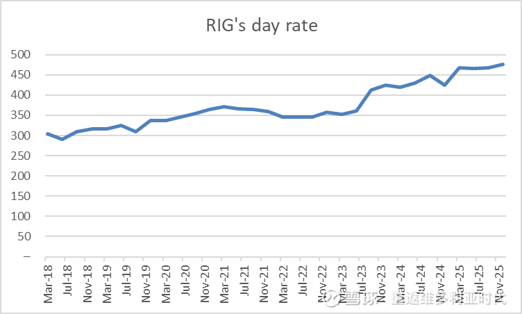 3、RIG 拥有行业最强的日费率议价权,而且经过淘汰老旧产能,持续优化资产质量,过去几年RIG的日费率一直在上涨,25年已经到了46万美金。