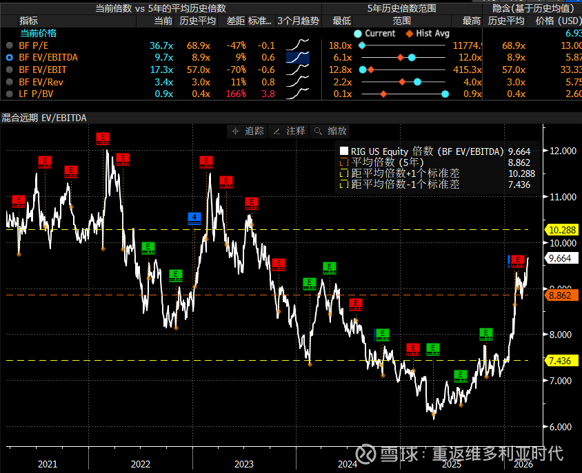 过去五年RIG历史估值区间上沿在10.3x,但高的时候也有12x