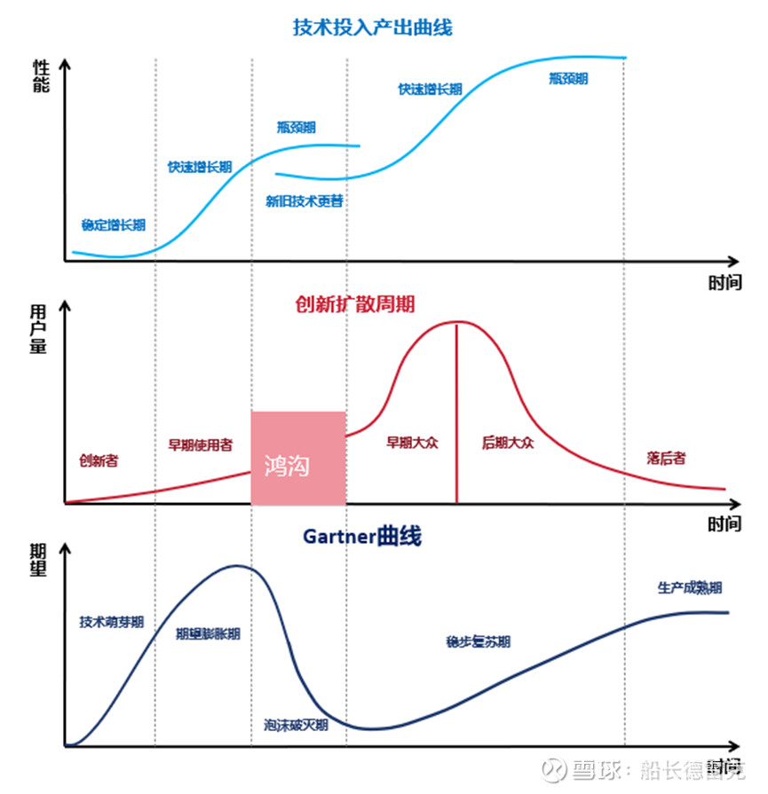 在新技术诞生后,首先会进入导入期,由金融资本主导的爆发。这个阶段是由想象和预期驱动的,能得到金融资本扶持的企业会处于领先地位。但预期泡沫吹大的速度一定是快于生产力提升速度,终有一个转折点,行业会从狂热瞬间冷静,开始关注技术的商业价值。转折点通常就是行业泡沫破灭出清的时间,在这个痛苦的时点,