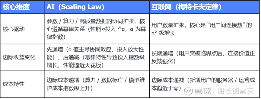 商业原理上看,互联网遵循梅特卡夫定律,先到先得,强者恒强,而AI却被Scaling Law限制,后发会更经济的追平先发优势。