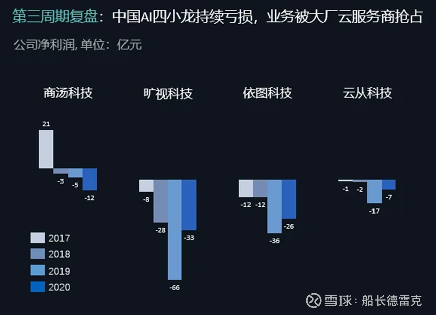 回顾从2009年到2020年的上一轮AI深度学习浪潮,无论是中国还是美国市场,都诞生了大量采用早期All in 技术,外部融资等输家策略的创业公司,最终结果大部分不尽如人意,给投资人带来了很大的损失,中国比较有名的就是上一次的计算机视觉四小龙,商汤科技、旷视科技、依图科技、云从科技等,始终没有找到很好的商业化路径。