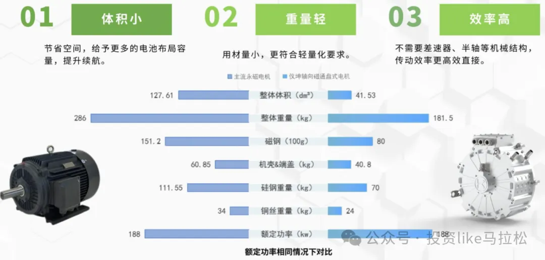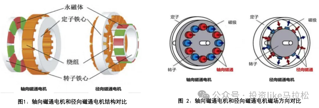 (1)性能优势:在输出同等功率的前提下,与径向磁通电机相比,轴向电机拥有更少零部件和更小摩擦损耗,效率更高。