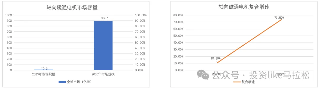 轴向磁通电机市场正处在爆发式增长的前夜。根据QYResearch的研究数据,全球轴向磁通电机市场规模将从2023年的10.3亿元增至2030年的893.7亿元,年复合增长率高达73.5%。这一显著增长趋势主要驱动力来自于新能源汽车、电动飞行器、人形机器人等高端应用领域的快速发展。