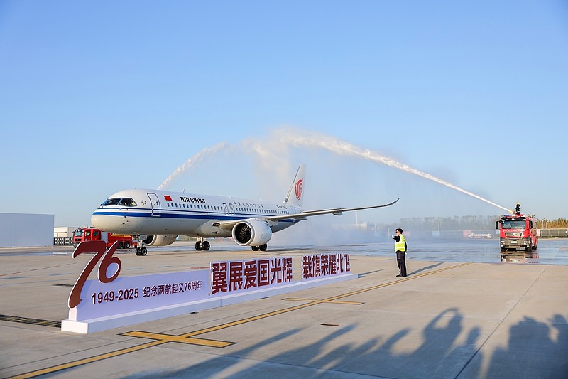 2025年11月9日16时01分,一架中国国航C919飞机“身披”五星红旗图案,从香港飞抵天津,飞机降落后缓缓滑行,接受了民航界的最高礼遇——“过水门”。