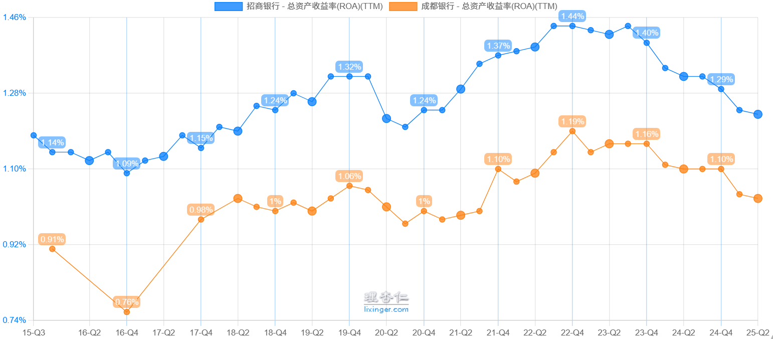 1)资金利用效率:招商银行的总资产收益率为1.23%,成都银行为1.03%。同样100元资产,招行赚1.23元,成都银行赚1.03元,少了0.2元;