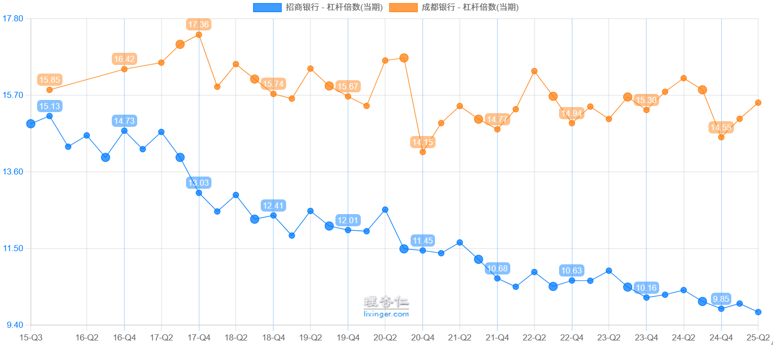 2)杠杆倍数:招行的杠杆倍数为9.76,成都银行为15.50,杠杆越高风险更高;