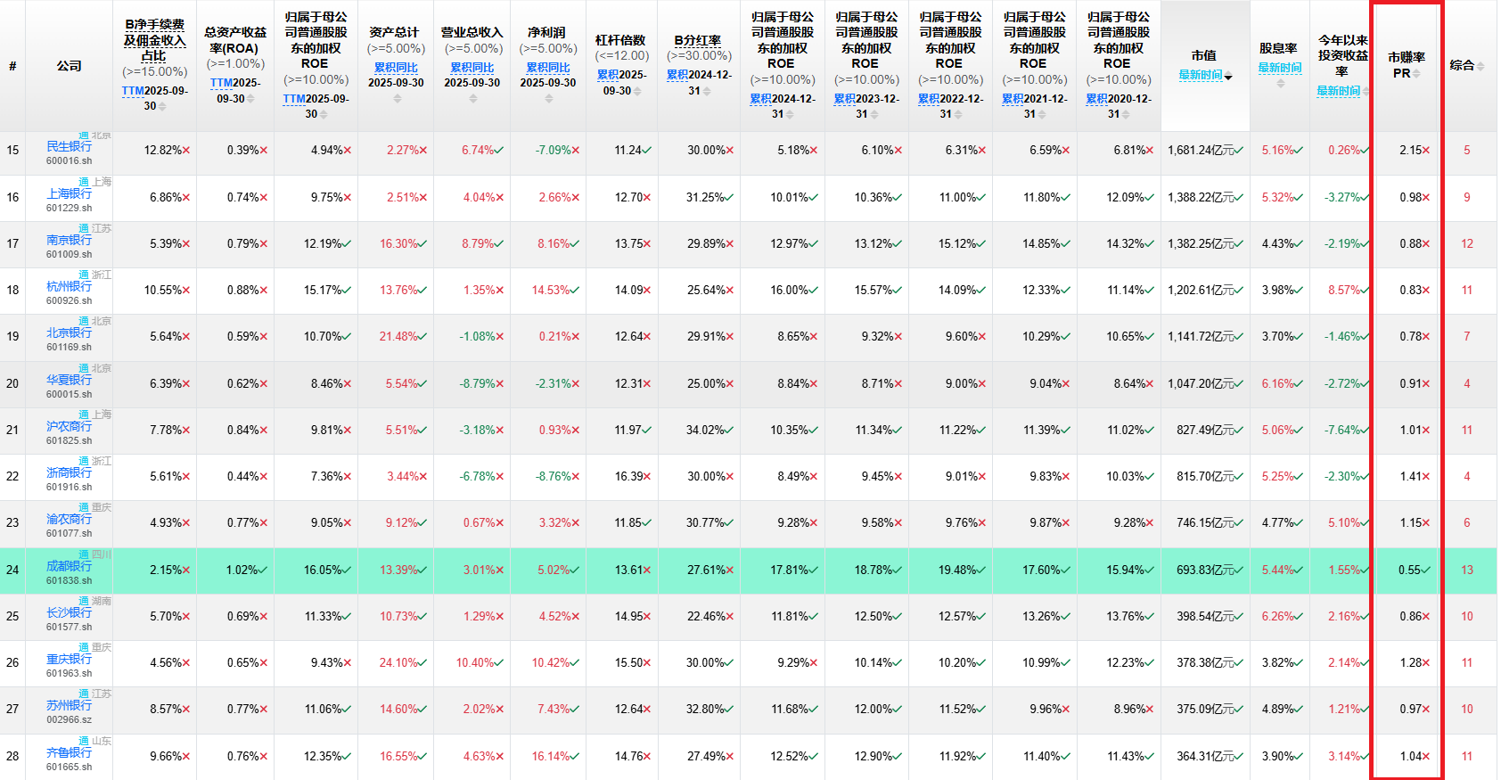 虽说成都银行的PR0.54很低,但整个行业高估,倾巢之下焉有完卵。另一例子,招行基本面在银行业里最优,PR0.74也仍然低于所有大行。