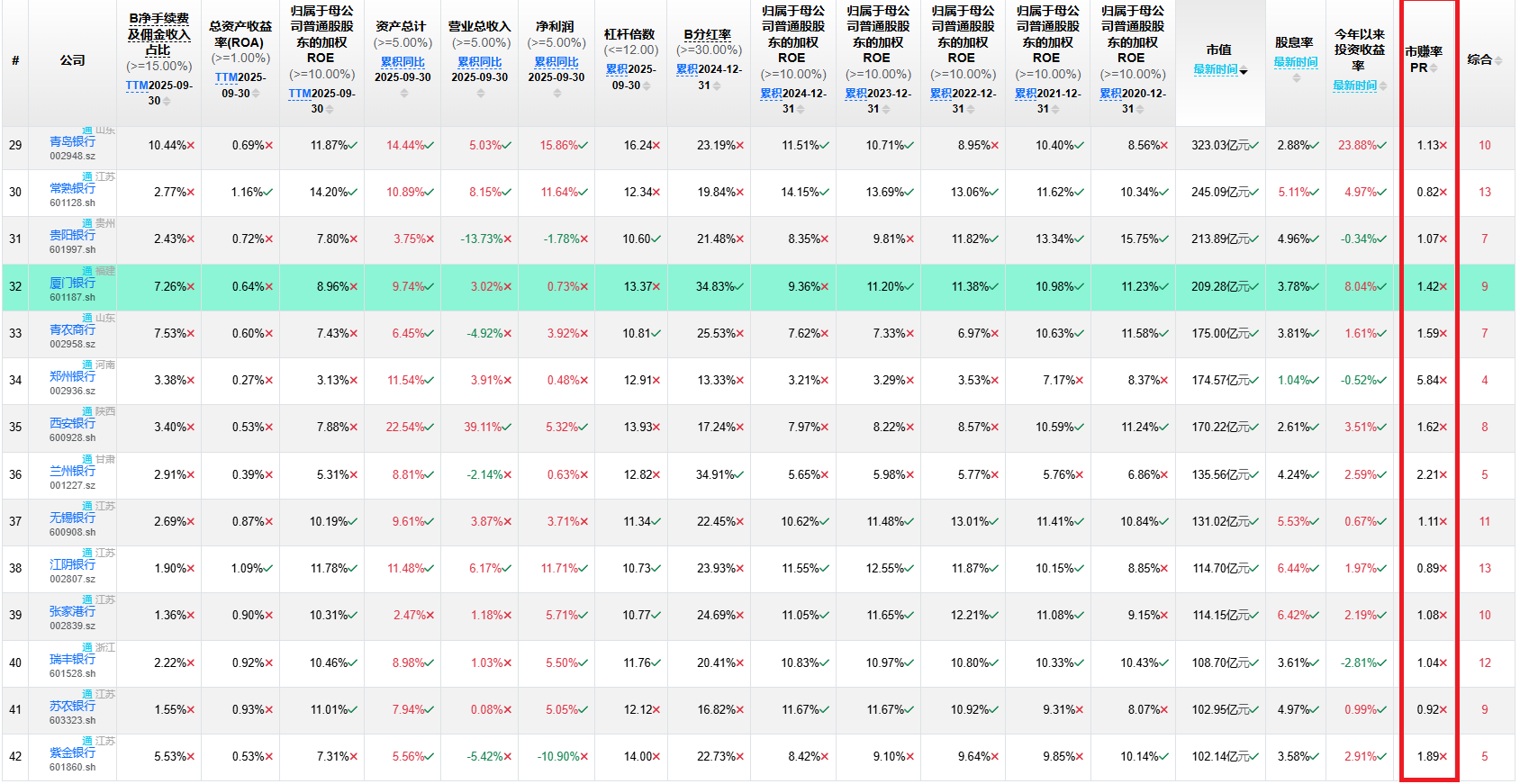 从市赚率来看,银行业中大多数公司的价格超过了卖出水平(PR=1.0),总体处于高估状态。