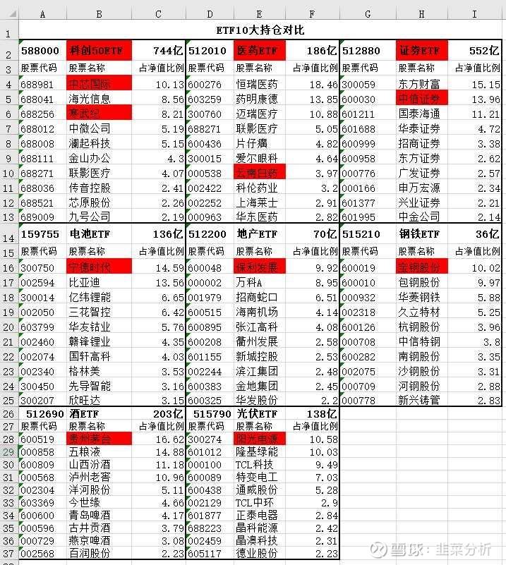 更新下几支ETF十大持仓,涵盖80支个股,没一个重复的。