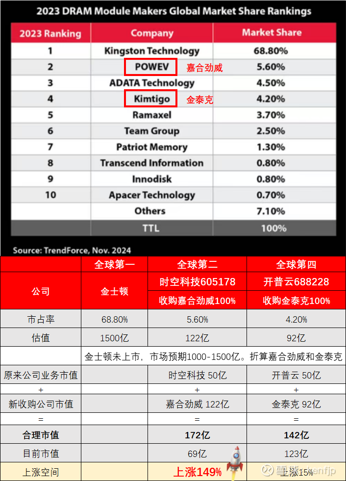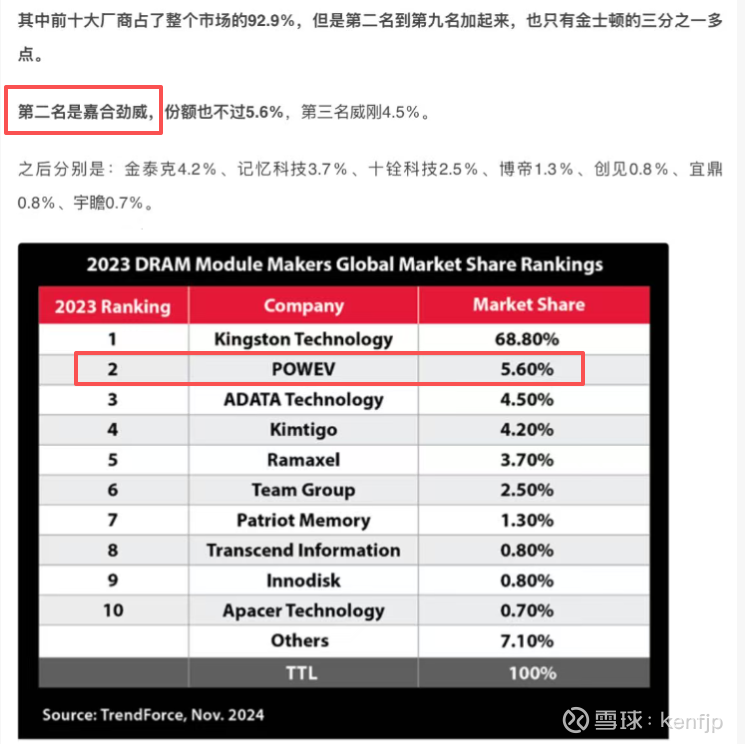 嘉合劲威DRAM内存模组厂商排名全球第二,仅次于全球第一金士顿。