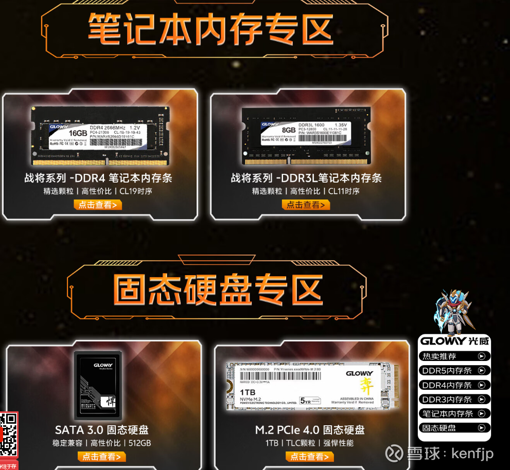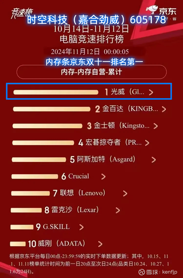 在国内市场,嘉合劲威的消费类产品一直占据着主导地位。自2019年起,嘉合劲威旗下品牌常年占据国内电商平台销量前两位,成为国内品牌市场占有率第一的厂商。2023年刚刚过去的618期间,京东平台数据显示,内存品类总销量47.5万支,销售额1.45亿人民币,嘉合劲威总销量120K,销售额约3300万,占大盘23%,其他国产内存厂商也击败美台内存厂商,前10名中,国产品牌占据6席,超过海外品牌。