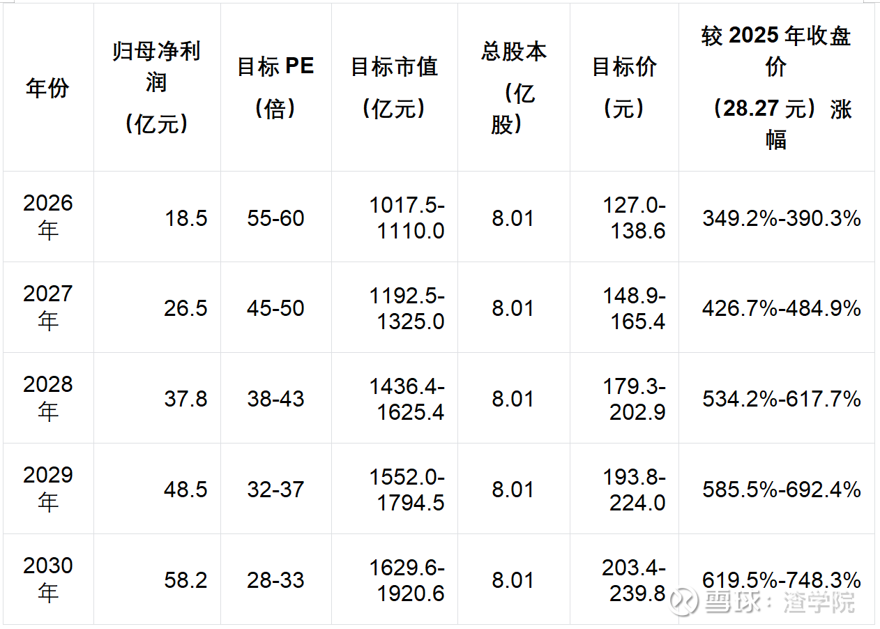 长期(2030年):业绩增速放缓至20%左右,估值切换至28-33倍,接近成熟行业估值水平,目标价随净利润增长稳步提升。