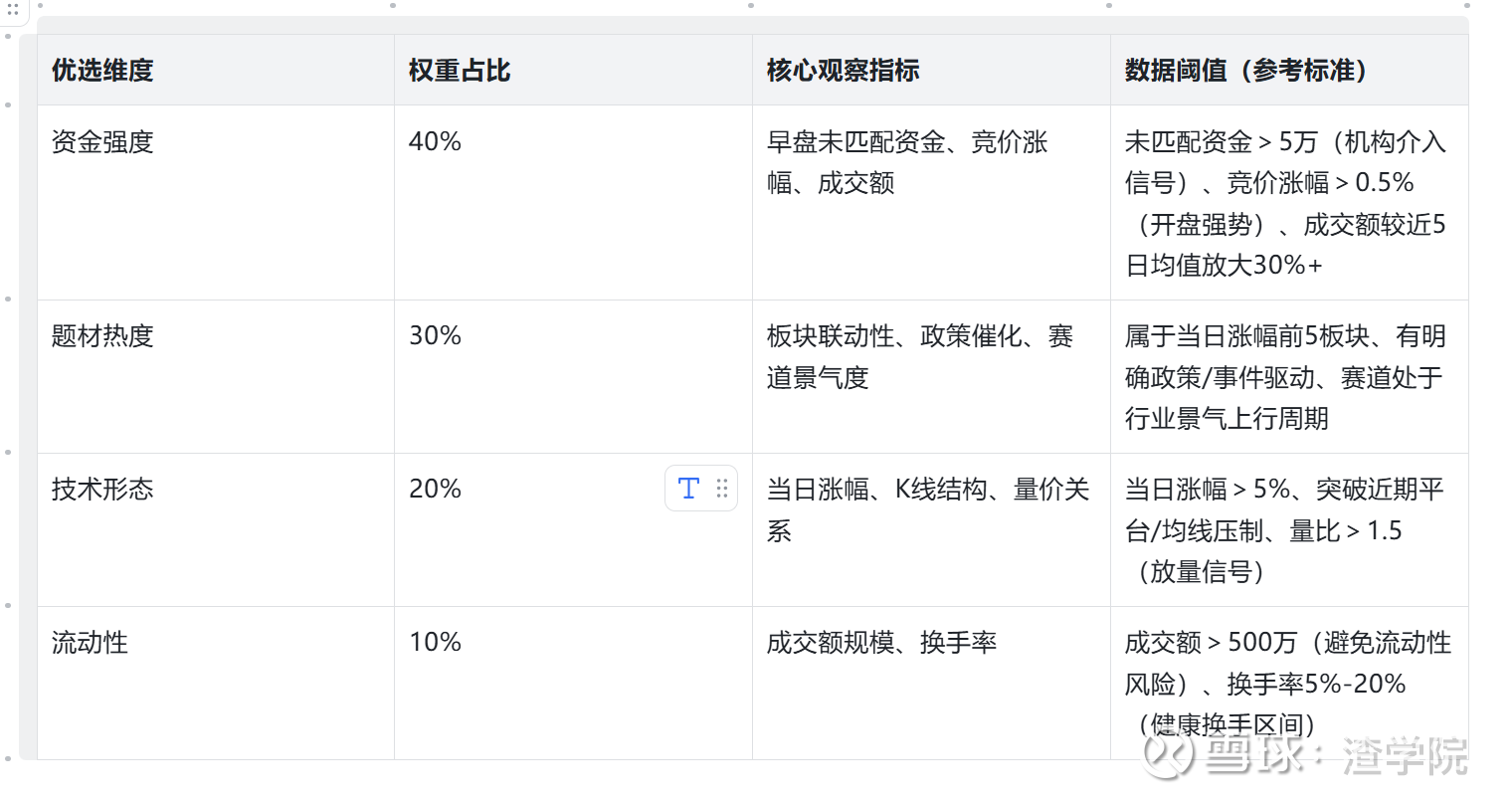 渣学院短线选股体系基于“资金+题材+技术”三维驱动模型,结合A股短线交易生态特征,对核心维度设置权重如下,确保选股逻辑量化可控、可追溯。