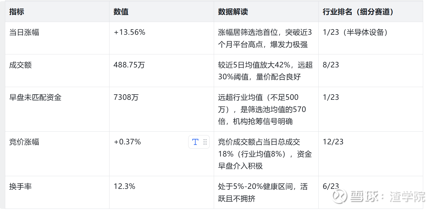 换手率12.3%(半导体设备板块平均换手率6.7%),处于「活跃但不拥挤」状态,既保证资金流动性,又未出现筹码松动迹象。