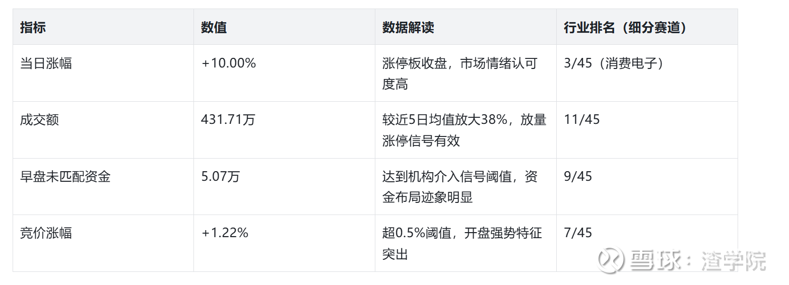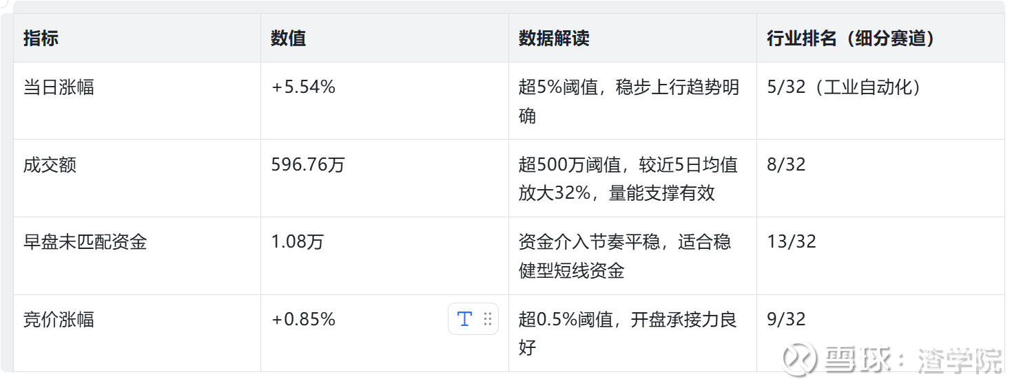 竞价数据佐证:竞价涨幅+0.37%,虽不突出,但竞价成交额占当日总成交的18%(行业均值8%),说明开盘前资金已开始集中介入,避免盘中追高成本。