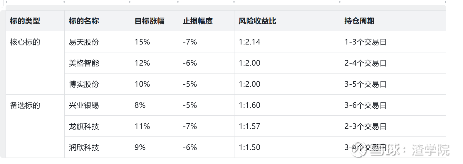 基于“目标涨幅≥10%、止损≤8%”的核心原则,核心与备选标的风险收益比均达标,具备短线操作价值