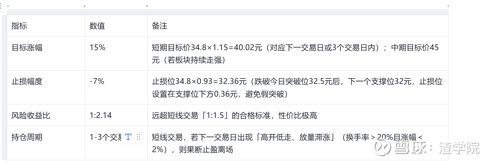 盘中低吸:若明日开盘后回调至33.5-34元区间(回调幅度2%-3%),且成交量未明显萎缩(换手率每小时>2%),加仓至50%;