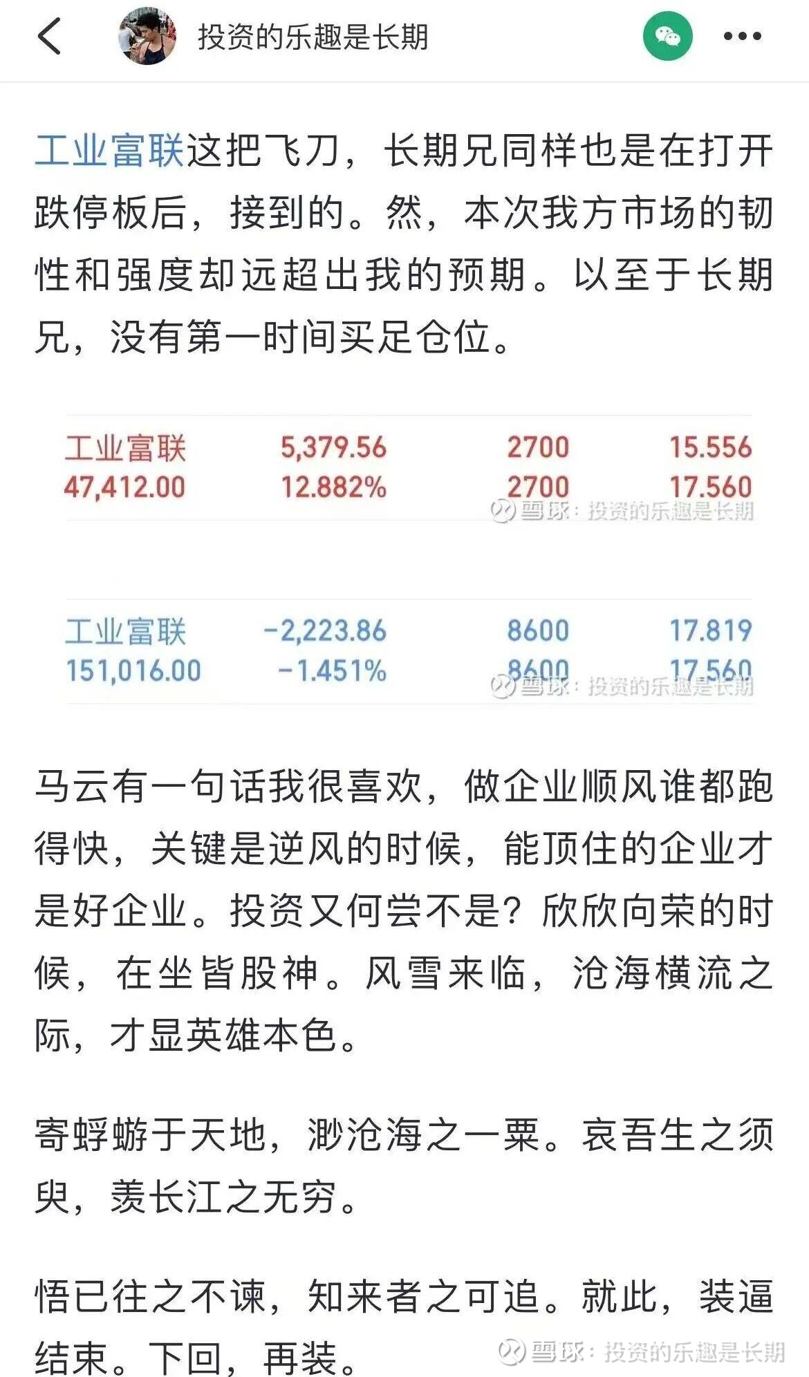 在今年的4月7号,当众人或恐慌或看戏的状态之下,长期兄在工业富联的跌停板上逆势买入。(文章名为:接飞刀的长期兄,雪球就有)