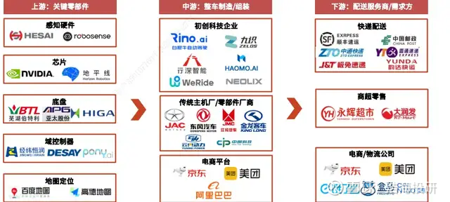 如果我们把无人物流车的产业链拆开,你会发现其产业链上游主要是感知硬件、芯片、底盘、域控制器等零部件,中游就是整车制造,也是核心环节,下游则是应用场景与运营服务。