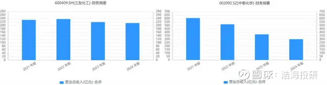 近期出炉的三季报显示,粘胶短纤 板块两大巨头$三友化工(SH600409)$ 与$中泰化学(SZ002092)$ ,营收双双下滑。三友实现营收141.64亿元,同比下降11.90%;中泰营收212.46亿元,同比下滑5.55%。拉长时间线看,自2021年以来,两家公司的营收几乎一路走低。