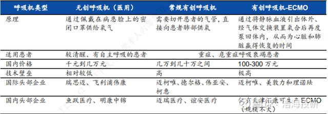 医用呼吸机一般分为无创和有创两种。无创呼吸机是通过面罩来供给氧气,院内主要用于清醒、有自主呼吸的患者,家庭场景的呼吸机也都是无创的。而有创呼吸机结构相对复杂,使用时需要切开患者的气管直接向肺部供氧,通常用于重症,已出现呼吸衰竭的患者,ECMO(俗称“人工肺部”)就属于有创呼吸机。