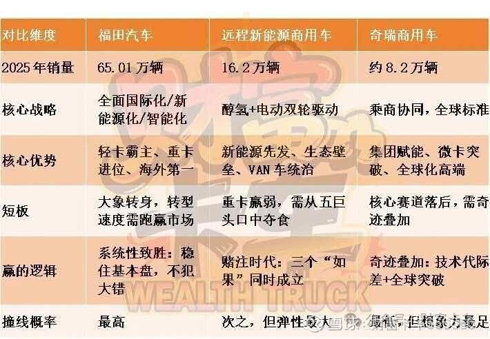 福田代表传统巨头的自我革新。它的赢面最大,不是因为跑得最快,而是因为它最懂这个行业的坑在哪里。从65万到100万,是“可计算的增长”。