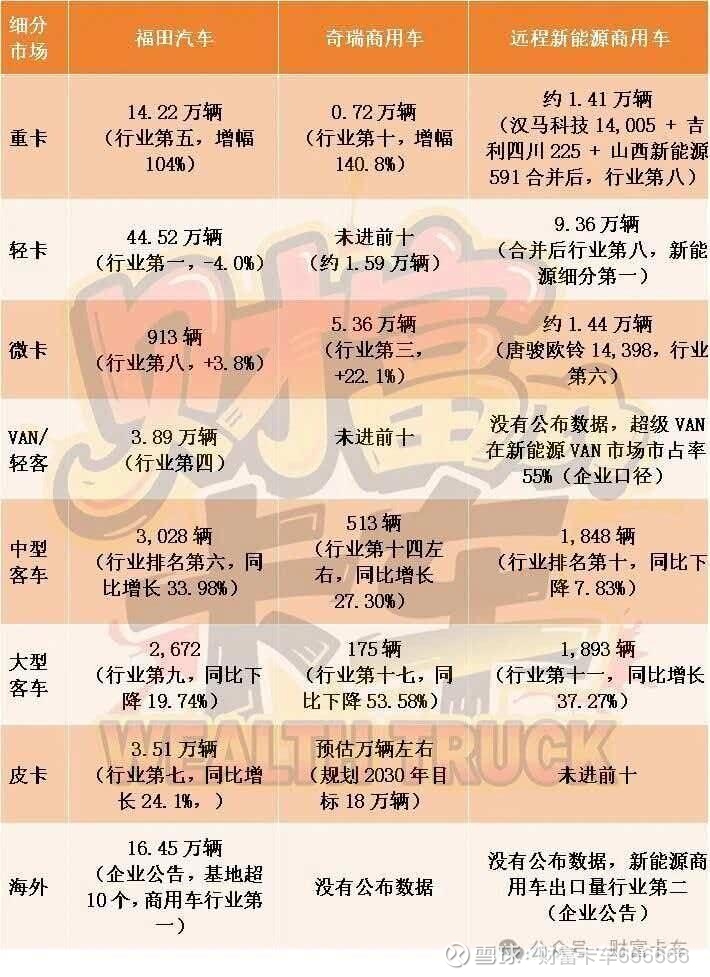 谁在最大的市场里吃肉?轻卡202万辆,是商用车最大的单一市场,福田是第一;重卡114万辆,是第二大市场,福田是第五。福田汽车是最接近终点的起跑者,它只需稳住基本盘,新能源加速渗透、重卡进位、海外放量稳步推进,实现年销百万辆目标的机率最大。
