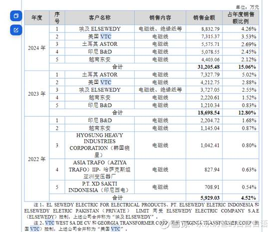 弗吉尼亚变压器公司(VTC)是北美最大的本土电力变压器制造商, VTC持续稳居宏远股份前五大海外客户之列。2023和2024年,宏远为VTC供货金额分别为4,212.75万元和7,315.37万元,增速超70%。