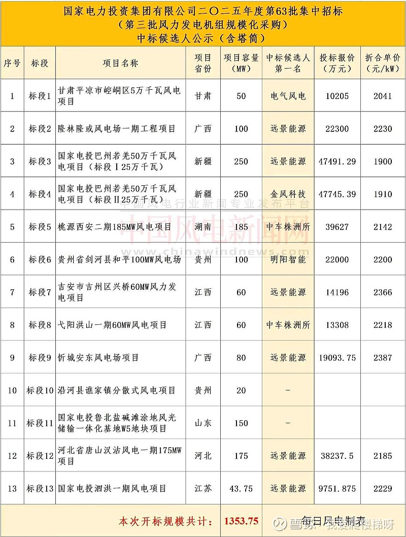 $金风科技(SZ002202)$ 中国风电新闻网讯:11月21日,国家电投公布二〇二五年度第63批集中招标(第三批风力发电机组规模化采购)、二〇二五年度第70批集中招标(山东公司山东半岛南5号海上风电一期600MW项目及二〇二五年度第79批集中招标(广东公司阳江三山岛三海上风电场项目风力发电机组及附属设备采购)招标中标候选人公示,开标项目规模共计2437.25MW(其中陆上项目1353.75MW,海上项目1083.5MW)。