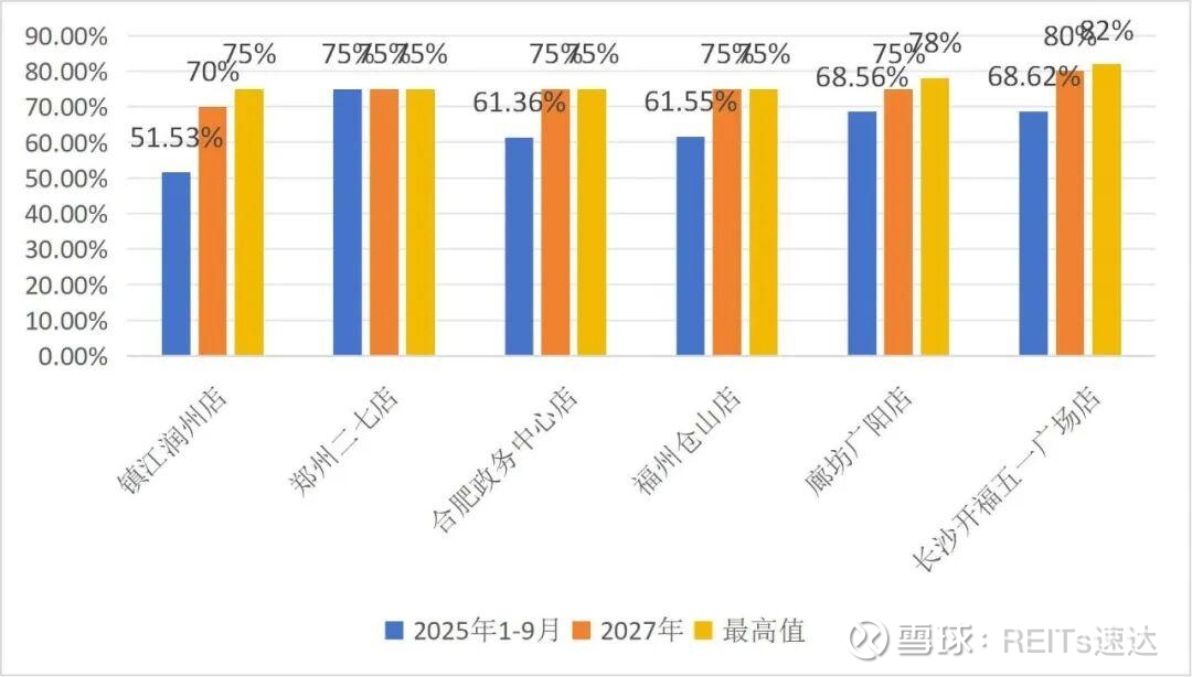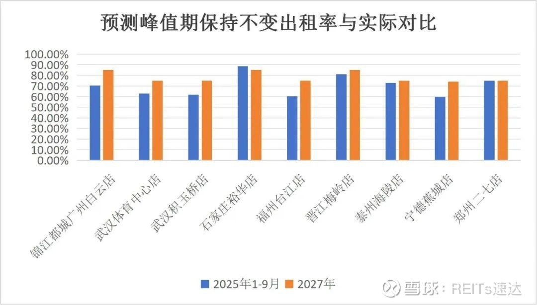 从给出的数据来看,9个门店的出租率在2027年达到峰值,且峰值出租率保持到存续期末。(郑州二七店较为有意思,最新出租率为75%,预测期内出租率不同年份有所变动,但预测期内仍维持在72%-75%区间)
