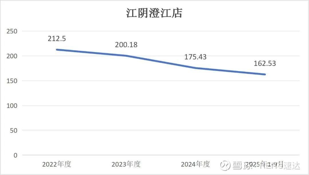 以常州新北店为例,房间单价连续下降,从246.73元/间连续3个年度持续下滑,最新一期仅为213.41元/间。江阴澄江店房间单价下降则更为明显。