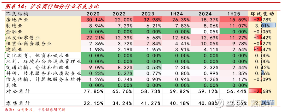 细分行业不良结构来看,对公:零售=56:44,对公中前三大不良占比行业分别为房地产业(15.59%)、批发零售(11.27%)、制造业(11.07%)。