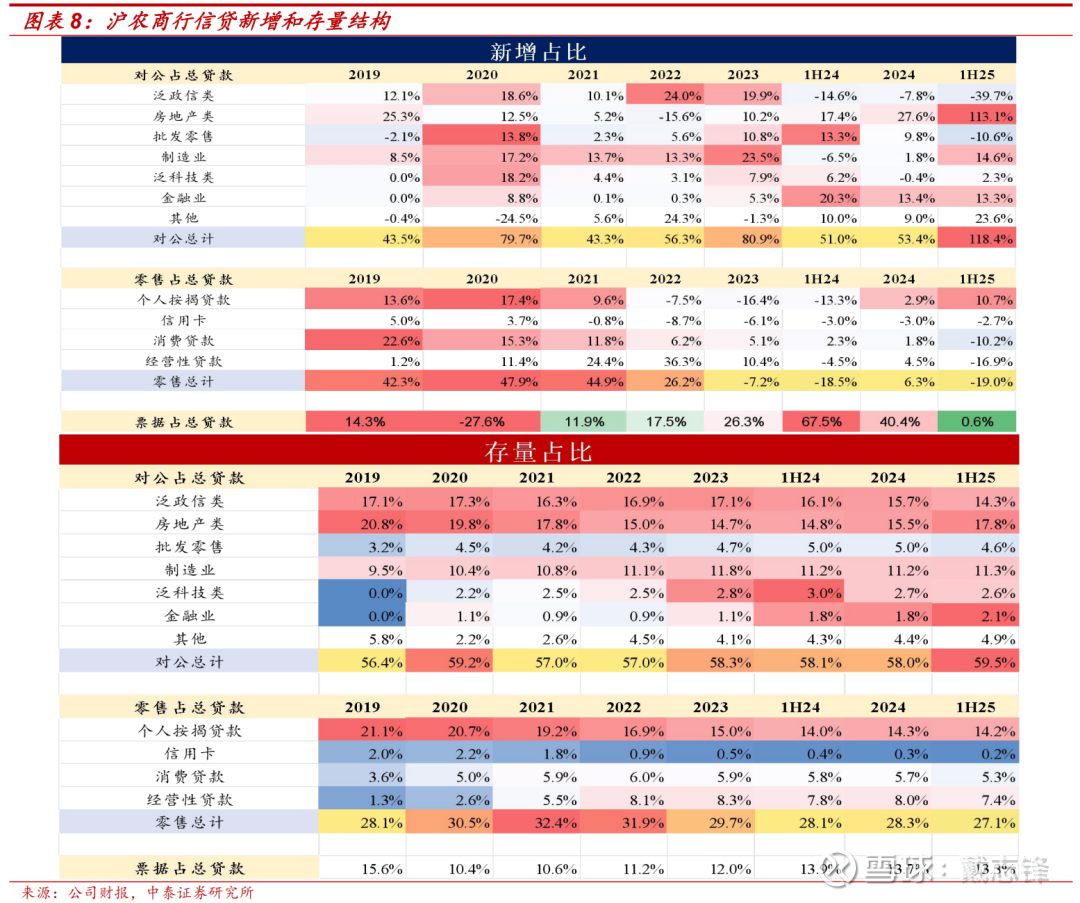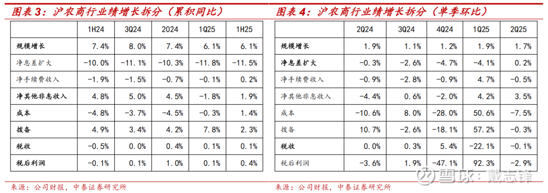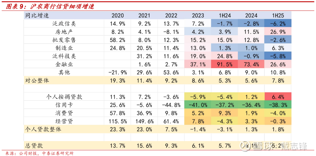 信贷增长结构:按揭带动零售增长。(1)对公:1H25房地产类同比+26.9%(预计主要是上海城中村改造等项目为主),制造业同比+6.3%。1H25新增占比结构来看,房地产类贡献113.1%;制造业与金融业随后,分别为14.6%、13.3%。(2)按揭带动零售增长:1H25按揭同比增长6.4%,信用卡、消费贷、经营贷分别同比下滑-38.3%、-4.0%、-0.3%,信用卡延续下降趋势,主要是主动压降导致。