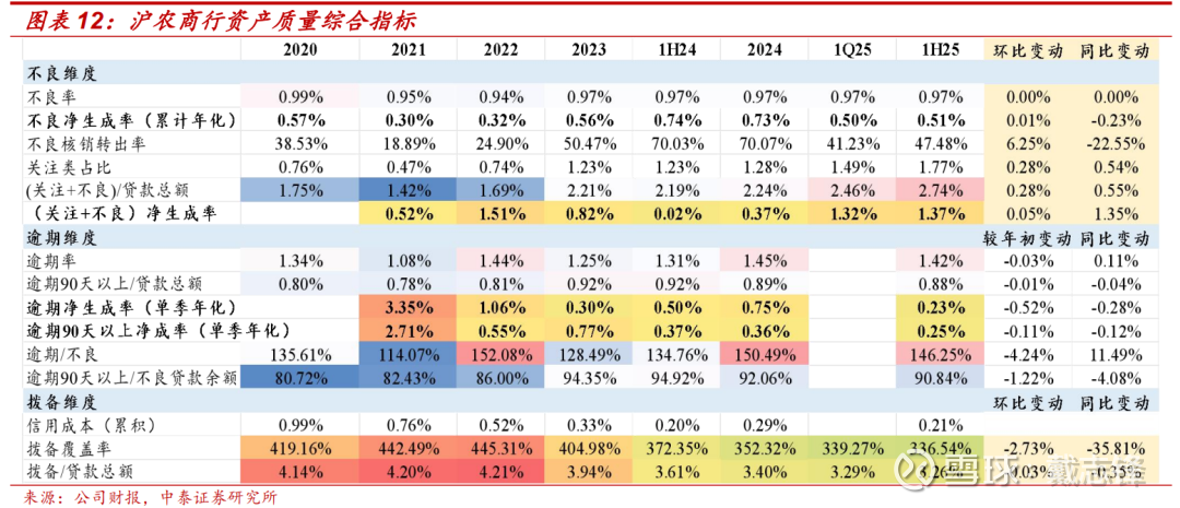 资产质量:(1)不良率、不良生成率均基本稳定。1H25不良率为0.97%,与上期持平。1H25不良生成率0.51%,同比+1bp;关注类贷款占比环比+28bp至1.77%。(2)1H25逾期率较年初下降3bp至1.42%。(3)拨备覆盖率环比小幅下滑。拨备覆盖率环比下降2.73个点至336.54%;拨贷比3.26%,环比下降3bp。
