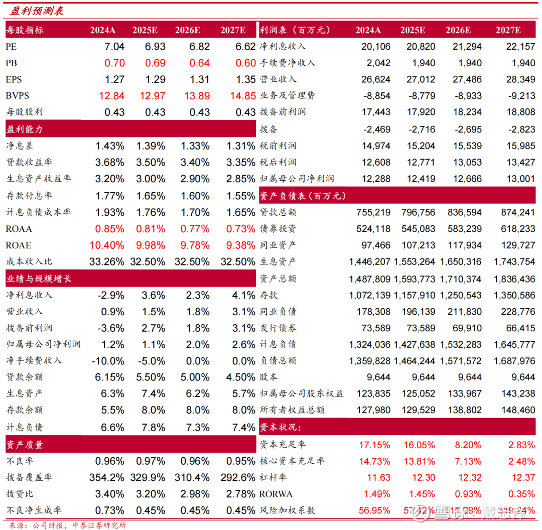 投资建议:公司2025E、2026E、2027E PB 0.69X/0.64X/0.60X;PE 6.93X/6.82X/6.62X。沪农商行扎根上海,辐射长三角,经营区位优质;资本充足、资产质量稳健、高分红有望持续,近年来科创金融逐步发力、零售转型初现成效、经营牌照有望逐步落地。短期业绩压力不影响其长期稳健特征,维持“增持”评级。