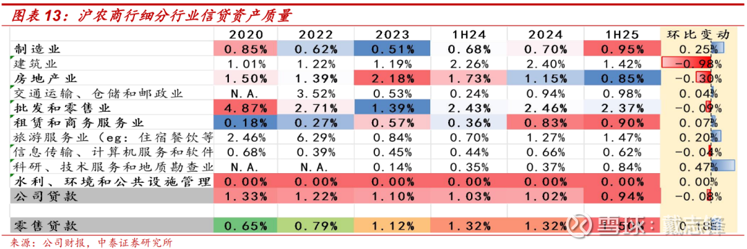 细分行业不良率:对公持续好转,零售不良率有所上升。截至1H25,行业不良率来看:(1)对公:不良率延续下降趋势,较年初下降8bp至0.94%,其中房地产业较年初下降30bp,建筑类较年初下降98bp。(2)零售:不良率较年初提升18bp至1.50%。