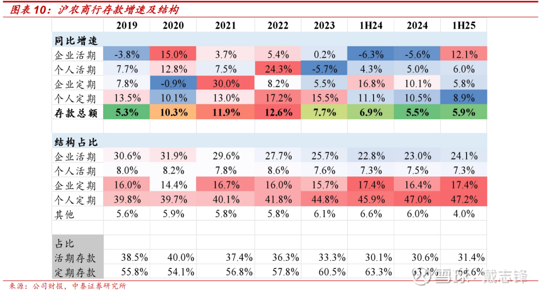存款增长结构:活期增长优秀,活期占比提升。1H25对公活期、对公定期、个人活期、个人定期分别同比12.1%、+5.8%、+6.0%、+8.9%。1H25整体活期存款占比31.4%,较年初提升0.9个点。