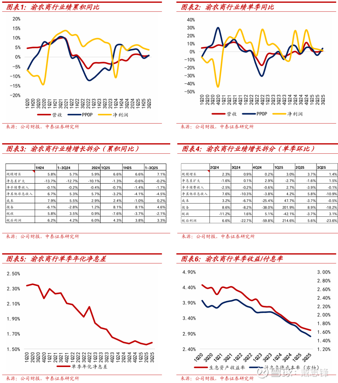 渝农商行2025年前三季度实现营业收入216.0亿元,同比增长0.7%(1H25为+0.5%),实现归母净利润107.0亿元,同比增长3.7%(1H25为+4.6%)。1)营收端:2025Q1-Q3渝农商行实现净利息净收入178.5亿元,同比增长6.9%(1H25为+6.0%),占营业收入比例为82.6%,环比上半年增加2.8个百分点;实现净手续费收入10.6亿元,同比下降16.7%,降幅环比扩大3.4个百分点;实现净其他非息收入26.91亿元,同比下降22.7%(1H25为-17.8%)。2)利润端:前三季度银行归母净利润同比增长3.7%,其中规模增长贡献比例最大,从边际变化来看,规模、息差、成本、税收贡献边际提升,手续费、其他非息、拨备贡献边际下滑。