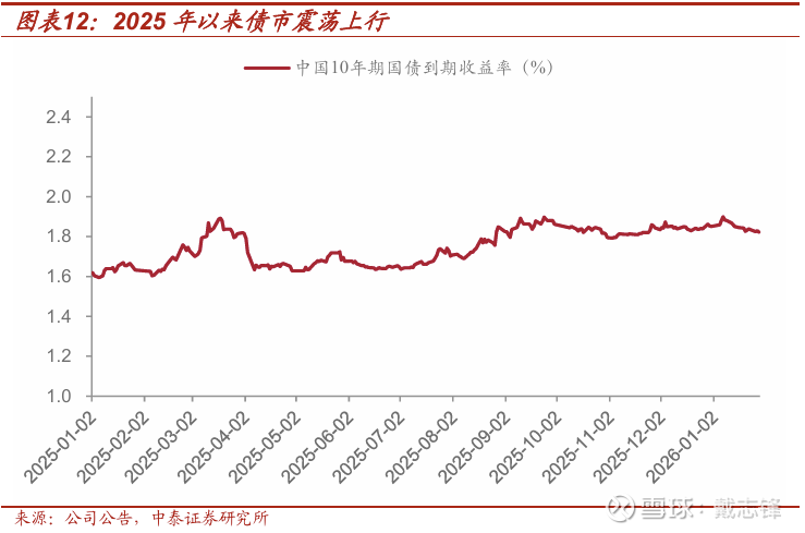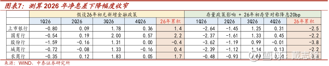 息差:不考虑2026年LPR调降,考虑前期的LPR、存款利率调整,以及2026年化债、发债成本上行,测算2026年净息差将企稳改善1.4bp。以上基础上,若2026年年初全期限LPR调降20bp、定期存款调降20bp,叠加前述存量政策影响,测算2026年净息差将合计下降2.5bp左右,息差降幅较2025年显著收窄。
