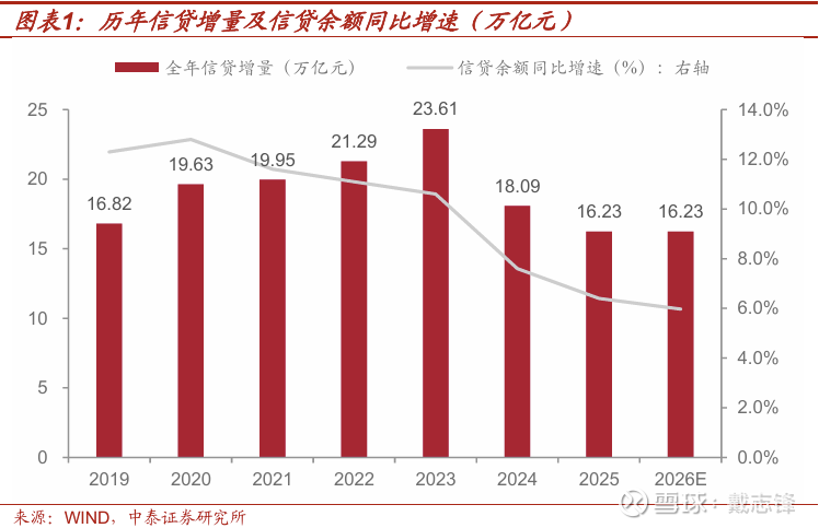 全年信贷规模预计:根据上市银行投放规划,预计2026年全年信贷增量预计与2025年或能持平,约16.23万亿元规模,增速预计收窄至6.0%左右(2025年增速6.4%)。
