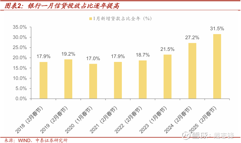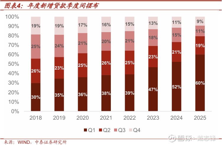 息差压力下,银行信贷投放明显提前,前移态势愈加显著。近年来,实体信贷融资需求有限,银行息差压力加大,各大银行基于“早投放早受益”的诉求,加快信贷投放节奏,前移投放时间,以尽早积累利息收入并抢占优质客户资源。投放季度摆布来看,一季度占比全年逐年递增,2025年一季度信贷新增占比高达60%。