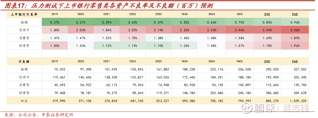资产质量:趋势延续,对公改善、零售暴露、总体稳健。零售资产质量压力仍将持续释放,预计2025年、2026年零售不良率难见明确拐点。结合我们在2026年1月8日外发报告《深度 | 银行四大零售资产的风险分析框架—按揭、信用卡、消费贷与经营贷》中的核心判断,中性预测下,25E按揭、经营贷、消费贷、信用卡不良率将分别较1H25提升10、11、11、0bp至0.85%、1.78%、1.69%、2.44%;26E按揭、信用卡、消费贷、经营贷不良率分别较25E提升11、12、20、18bp。得益于零售不良额增幅处于可控范围,且对公资产质量持续优化形成有效对冲,银行业整体资产质量大盘仍将保持稳健。
