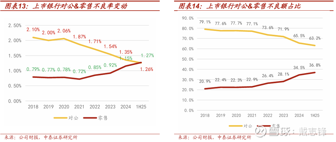 对公:得益于政信资产支撑、地产风险暴露峰值已过,对公不良率持续下降。核心支撑因素主要有两方面,一是政信类资产的稳健托底,地方政府债务化解进程稳步推进,政信项目回款确定性增强,为银行对公资产安全提供了重要保障;二是房地产行业风险暴露峰值已过,随着房企融资支持政策持续落地、行业供需关系逐步修复,房地产产业链相关对公贷款风险敞口进一步收敛,叠加银行对存量对公不良资产的处置力度加大,共同推动对公板块资产质量持续改善。